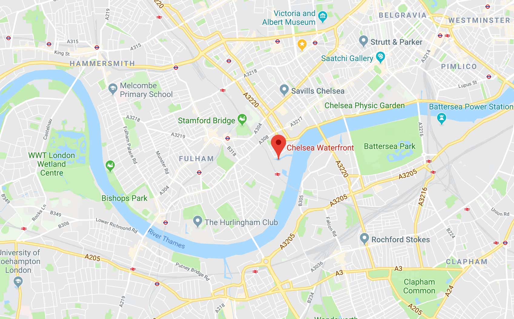 从项目步行5分钟可至帝国码头城铁站(Imperial Wharf),15分钟到达富勒姆宽街地铁站(Fulham Broadway),从这两站分别搭乘地铁到以下: